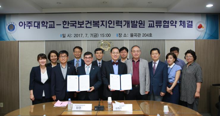 우리 학교와 한국보건복지인력개발원이 교류협약을 체결했다. 양 기관은 이번 협약을 바탕으로 보건 복지 교육 및 연구에 긴밀히 협력해갈 계획이다. 우리 학교에서는 약학 대학이 이번 협약을 주도했다. 지난 7일 오후 율곡관에서 열린 협약식에서 우리 학교 유희석 총장직무대행과 최영현 한국보건복지인력개발원 원장이 협약서에 서명하고 이를 교환했다. 이날 행사에는 최경희 산학부총장, 이범진 약학대학장, 김수동 글로벌제약임상대학원장, 김소희 약대 학과장, 박영준 약대 교수, 박귀례 약대 교수가 함께 자리했다. 한국보건복지인력개발원에서는 정례헌 경영본부장, 안인환 보건산업교육본부장, 조기형 보건생명교육본부장, 최승희 교육지원부장, 윤나비 질병관리교육부장 등이 참석했다. 양측은 ▲보건 복지 인재 양성 교육 프로그램 및 교재 개발 협력 ▲정책 개발 및 조사 연구 ▲인재 양성을 위한 인적·물적 자원 교류 등에 협력키로 했다. 최영현 한국보건복지인력개발원 원장은 “이번 협약을 기반으로 양 기관의 발전을 위한 다양한 활동을 기대한다”며 “실질적인 협력 관계 구축을 위해 다방면으로 최대한 힘쓸 것”이라고 말했다. 유희석 총장직무대행은 “이번 협약을 통해 두 기관이 작은 일에서부터 시작, 실질적인 협력하는 관계를 잘 구축해 나가기를 바란다”며 “작은 발걸음이 꾸준히 이어진다면 큰 성과를 만들어 낼 것으로 확신한다”고 전했다.