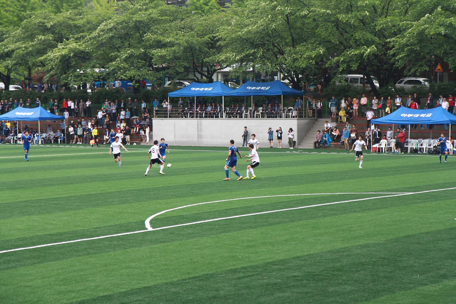 28일 우리 학교 체육관에서 ‘2013 AJOU 인조잔디구장 준공식’이 열렸다. 인조잔디구장은 올 2월부터 약 3개월에 걸쳐 조성됐으며 국제 경기장 규모 1면과 보조구장 1면 총 2면의 축구경기장으로 이뤄져 있다. 이날 오전 11시부터 진행된 준공식에는 추호석 대우학원 이사장, 안재환 아주대 총장, 김진표 국회의원, 염태영 수원시장, 변석화 대학축구연맹회장, 하석주 전남드래곤즈 감독 등이 참석했다. 송현호 학생처장이 인조잔디 구장 조성 경과를 발표했고 염태영 수원시장과 김진표 국회의원, 변석화 대학축구연맹 회장이 축사를 했다. 안재환 총장은 기념사를 통해 “인조잔디 구장 건립으로 아주대학교와 지역사회가 같이 소통하고 교류할 수 있게 되었다”며 “학생들과 시민들이 함께 숨 쉴 수 있는 생활문화 공간이 될 것”이라고 말했다. 안 총장은 이어 “잔디구장 건립은 많은 분들의 도움과 협조를 통해 이뤄졌다”며 “앞으로 아주대학교는 홈 앤 어웨이 방식으로 진행되는 대학 축구리그 개최지로서 그 역할을 다 하게 될 것”이라고 덧붙였다. 인조잔디구장에는 농구장, 족구장, 육상트랙, 라이트 등의 시설도 함께 마련되어 있다. 앞으로 우리 학교 학생들 뿐 아니라 수원 시민들에게도 개방, 생활체육시설로도 활용토록 할 예정. 한편 오전 준공식에 이어 오후 1시30분부터는 아주대 축구부와 수원 블루윙즈의 친선경기가 열렸다. 수원 블루윙즈가 1대0으로 승리했다.