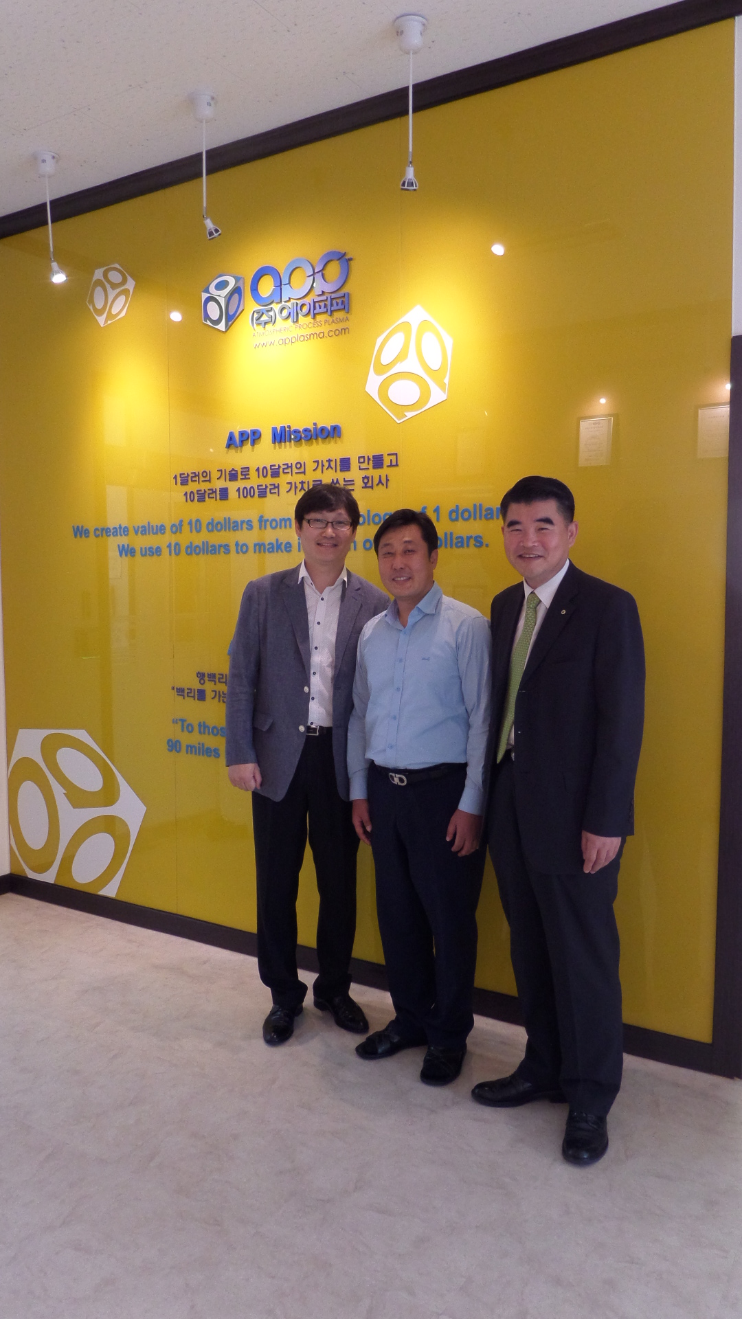 방문대상자 성 함 : 강방* 대표이사(화공90‘) 소 속 : ㈜에이피피 방문자 성명 : 이강준, 황원복(대학발전팀) 방문일시 : 2015년 9월 18일 14시 30분 방문장소 : ㈜에이피피 본사 – 경기도 화성시 동탄면 동탄산단2길 7-12 (동탄면 방교리 846-3) ㈜에이피피는 진공플라즈마의 고품질을 대기압에서 실현한 대기압 플라즈마 발생기술 및 장치를 특허로 보유한 플라즈마 전문회사로 2006년 2월에 설립되었다. 창업과 함께 안전하면서도 간편하게 사용할 수 있는 세계최대 면적의 핸드플라즈마 장비인 [마이플100]과 [마이플200]의 개발을 시작으로 연이어 산업용 플라즈마 장비 및 모듈형, 에칭용 등 다양한 플라즈마 장비를 개발하였다. 기능적으로 소재의 개질 및 세정 등 표면 처리를 기본으로 하여 에싱, 에칭, 화원, 살균, 초소수성 박막 등 기능성 솔루션을 위한 다양한 형태의 표면처리 장비를 개발, 공급하고 있다. 모교 창업보육센타에서 3년간 연구개발에 집중하여 회사의 기술적 토대를 마련하였고, 2010년 삼성테크노파크를 거쳐 2014년 1월 동탄산업단지로 본사를 이전하였다. 현재 총 20명의 직원으로 매출의 70% 이상이 해외 거래에서 발생하고 있다. 2014년 무역의 날에 “백만불 수출의 탑”을 수상하였고 2015년 8월 현재 60억원 정도의 매출을 보이고 있다. 강방* 대표는 화학공학과 90학번으로 2002년에 대학원 분자과학기술학과를 졸업하였고 자체 개발의 특허기술로 승부하기 위한 창업을 결심하였다. 지난 2013년도부터 시작한 모교 경영대학원의 경영관리MBA를 거치면서 ‘작은 중소기업도 글로벌 경쟁을 해야 한다!’는 현실 자각과 함께 100년 기업을 위한 ‘기업문화’에 관심을 가지게 되었다. ‘경쟁력 있는 기업’과 ‘강한 기업문화’, ‘인재확보’라는 화두를 직원 전체가 공유하기위해 노력하고 있으며, 2015년 1월부터 기업문화 정착을 위해 컨설팅을 진행하고 있다. 강 대표는 사람의 성장이 기업의 지속성장을 유지하는 비결이라고 말하며, 이를 위해 모두에게 몰두하여야 한다고 말했다. 특히, 이익과 가치가 상충될 때는 1%의 역설을 가능하게 하는 힘의 원천으로 무엇보다 ‘진실’하여야 한다고 평소 경영관을 피력하였다.