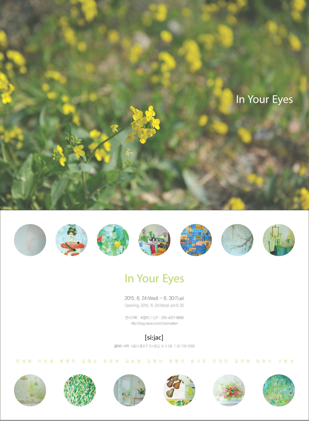 In Your Eyes 展 2015_0624 ▶ 2015_0630 참여작가 안성채 이선화 현영주 김영순 오명희 김승정 김영선 송지윤 민경란 김권명 정영선 임현수 구본성 초대일시_2015_0624_수요일_06:00pm 전시기획_최정미 관람시간 / 10:00am~06:00pm 갤러리 시작 Gallery Sijac 서울시 종로구 인사동 39 2F Tel_02_735_6266 www.Sijac.kr 아주대학교 평생교육원 회화(수채화&유화)과정 수강생들의 작품을 선보이는 전시 “In Your Eyes"展이 오는 6월 24일부터 6월 30일까지 인사동 갤러리 시작 Gallery Sijac (서울시 종로구 인사동 39 2층)에서 열린다. 이번 전시를 기획한 회화(수채화&유화) 과정의 강사 최정미는 작가, 전시기획자, 경희대 겸임교수로서 2005년 아주대 평생교육원에서 일반인들을 대상으로 미술교육을 시작하다가 비전공자인 수강생들의 재능을 발견하고 취미위주의 작가를 생산하는 교육이 아닌 미술대학의 전문교육과정을 적용 2, 3년의 기본교육을 시도하였다. “In Your Eyes"展 13명의 참여작가들은 의사, 교육자, 직장인, 주부, 개인사업자 등 다양한 직업군의 사람들이 모여 일주일에 3시간의 수업시간 외에 틈틈이 시간을 내어 작업하며, 갈고 닦은 멋진 솜씨로 잠재되어있는 미술창작활동의 꿈을 펼쳤다. 전시회안내 전시명: In Your Eyes 展 참여작가: 안성채,이선화, 현영주, 김영순, 오명희, 김승정, 김영선, 송지윤, 민경란, 김권명, 정영선, 임현수, 구본성 전시기간: 2015년 6월24일 ~ 2015년 6월30일 전시장소: 갤러리 시작(서울 종로구 인사동 39 2층) 전시기획: 최정미 http://blog.naver.com/choicreation