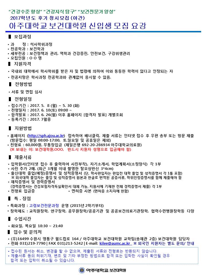 [보건대학원] 2017학년도 후기모집 안내