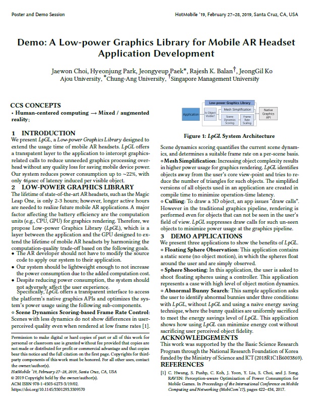 우리 학교 정보통신대학 구성원들이 속한 연구팀이 HotMobile 2019 학술대회에서 'Best Demo Paper Award'를 수상했다. 우리 학교 최재원(컴퓨터공학과, 석박통합과정), 박현정(소프트웨어학과) 학생과 고정길 교수(소프트웨어학과)를 비롯해 백정엽 중앙대 교수, Rajesh Krishna Balan 싱가포르 경영대학 교수는 한 팀을 이뤄 지난달 27일부터~28일 양일간 미국 산타크루즈에서 열린 학술대회에 참가했다. 연구팀은 사용자의 인재 패턴을 기반으로 모바일 증강현실 콘텐츠를 저전력화하는 기술을 개발해 이를 학술대회에서 시연했다. 해당 논문의 제목은 이다. 우리 학교 최재원 학생은 "본 상을 수상하게 되어 영광"이라며, "앞으로도 이와 같이 그래픽스와 모바일 컴퓨팅 분야를 접목시키는 연구를 더욱 더 열심히 해나가겠다"고 말했다. HotMobile 학술대회는 ACM SIGMOBILE에서 공식적으로 주최하는 학술교류 행사로, 올해 25회째를 맞았다. 특히, 이동형 컴퓨팅 기술 관련 논문들이 발표되고 있는 우수 학술대회로 꼽히고 있다.